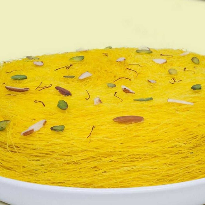 Indulge in the delicate richness of Kesar SutarFeni, a royal sweet delight from Ratilal Chunilal Halwasanvala, Khambhat. Crafted with the finest wheat flour, pure milk, sugar, crunchy dry fruits, pista, and the exotic touch of saffron (kesar), this traditional Gujarati dessert melts in your mouth with every bite.